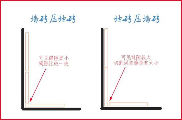 墻地面都需要貼瓷磚的地方,需要考慮墻磚壓地磚還是地磚壓墻磚。兩種貼磚方式最大的區(qū)別,是視覺效果。地磚壓墻磚,會(huì)留下一道向上的縫隙,俗稱“朝天縫”。這道縫非常明顯,而且非常容易在縫隙里積水。墻磚壓地磚,也會(huì)留下一道縫,不過這道縫就變成了朝向側(cè)面的。正??催^去,視線是斜向下的,看不到這道縫。
