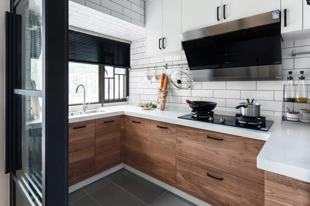 ??3、除帶窗戶的墻面外,廚房的靠墻處都安裝了廚柜??窟叺那逑磪^(qū)采用了木質(zhì)貼面的家具材質(zhì),相比現(xiàn)代感十足的黑白廚柜,木紋理的家具在突出其實木質(zhì)感的同時,也展現(xiàn)出強(qiáng)烈的現(xiàn)代感。