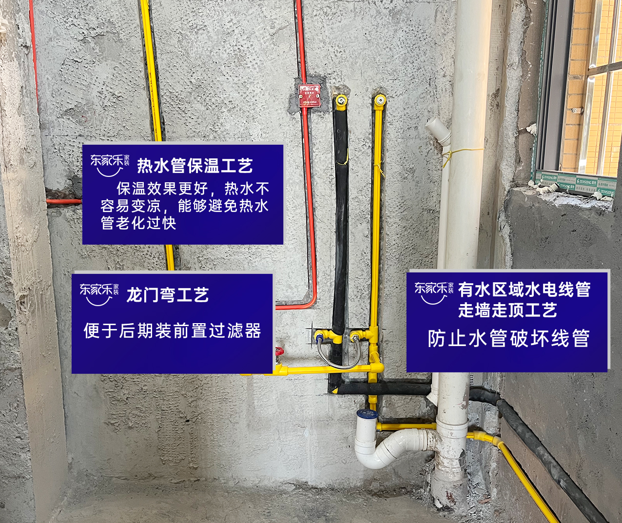 東家樂家裝的水暖工程,運用冷熱水管保溫工藝、龍門彎工藝、有水區(qū)域水電線管走墻走頂工藝、連體內絲彎工藝、給水管安裝等多項先進工藝,保障了水路暢通,暖通使用更方便。