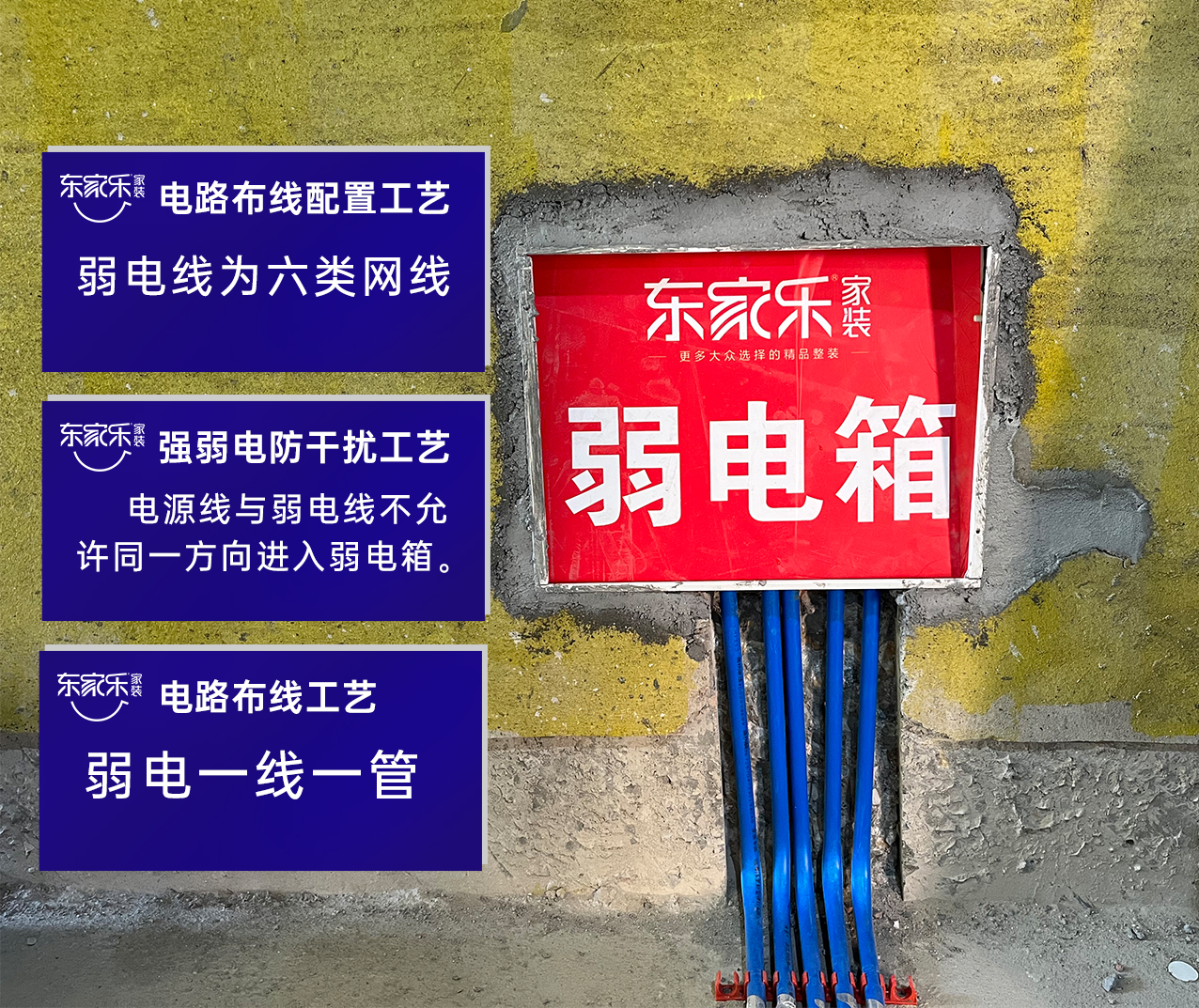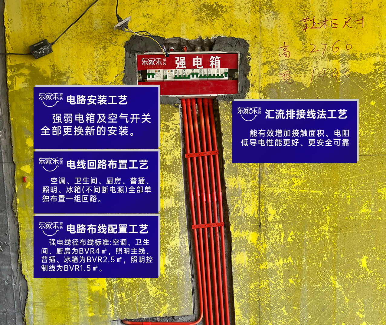東家樂家裝的電路工程,運用電線回路布置工藝、電線布線配置工藝、匯流排接線法工藝、電路安裝工藝、強弱電防干擾工藝、電路布線工藝等標準工藝,保障了用電的安全,放心又安心。