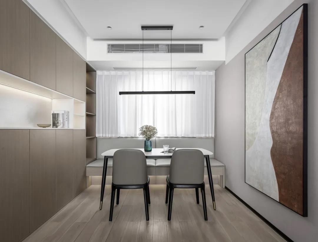 ??餐桌正對面就是一組白色餐邊柜,柜子中間采用鏤空設(shè)計,墻上還做了一塊隔板,用來放置小擺,吊柜下方裝了一排射燈,從各個角度看,都是美麗的;人間煙火氣,最撫慰人心,餐廳煙火氣的聚散,恰是世界上最溫馨的事物,與家人共享美食,即便是粗茶淡飯,也覺得幸福、美好。
