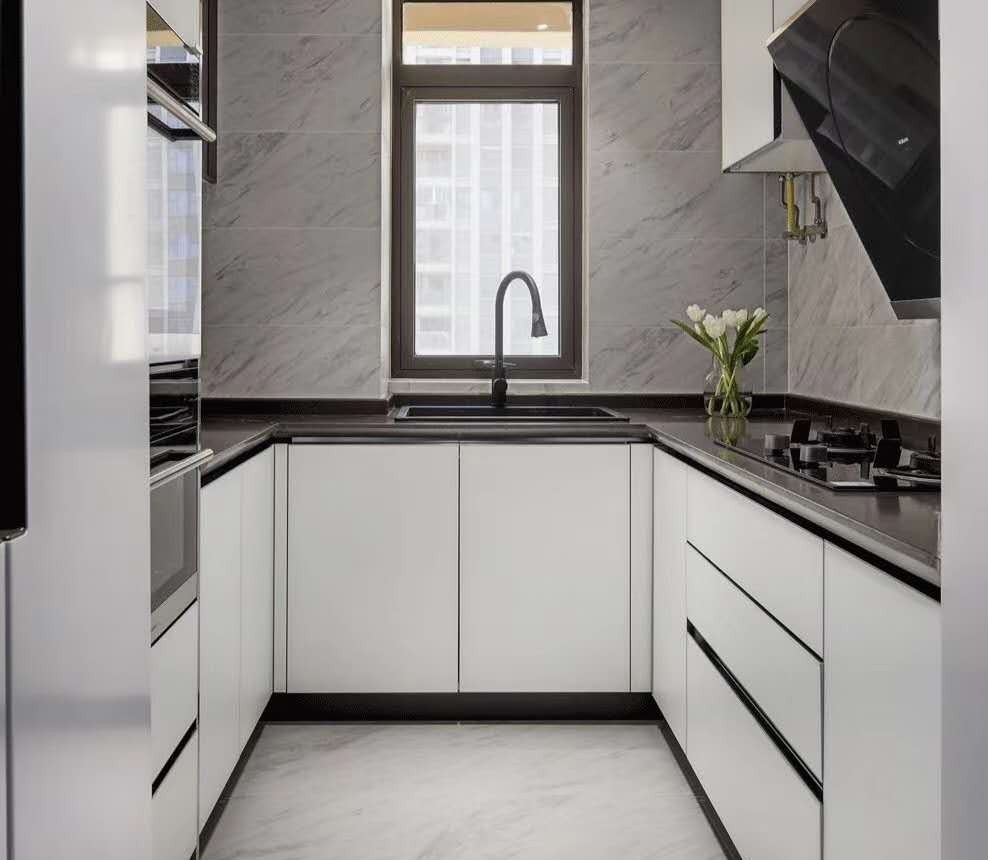 4、選擇合適的顏色:在選擇U型廚房的顏色時(shí),也要考慮到其重要性??梢赃x擇一些明亮的顏色,例如白色和灰色,來增加空間感和采光。同時(shí),可以在墻面、櫥柜和地面上選擇不同的顏色和材料進(jìn)行搭配,以創(chuàng)造出更加令人舒適的視覺效果。