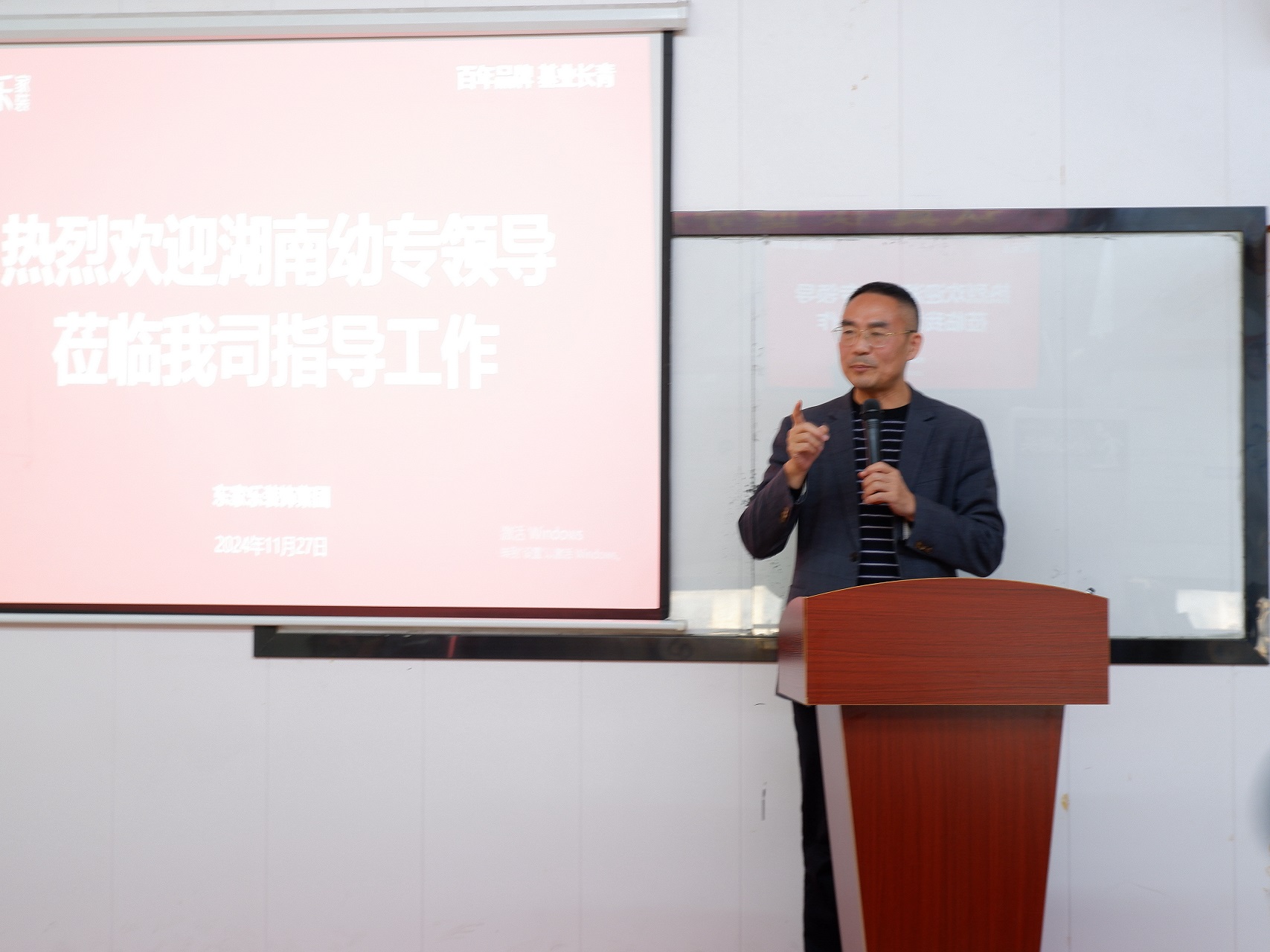 在致辭環(huán)節(jié),湖南幼專高金平校長對東家樂集團的熱情接待與全面展示表示衷心感謝。他表示,通過此次參觀與交流,深切感受到東家樂集團的專業(yè)與專注,尤其是對董事長從基層做起的匠人精神和規(guī)范的自營連鎖模式表示高度贊賞。同時,高校長介紹了湖南幼專悠久的歷史傳承、雄厚的師資力量,強調(diào)學校一直以來致力于培養(yǎng)學生在專業(yè)領域有所建樹,期待與東家樂集團強強聯(lián)合,共同為家裝行業(yè)培育出更多優(yōu)秀的專業(yè)人才。