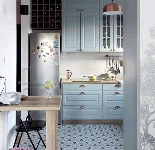 藍色給人的感覺很清爽,廚房中若是使用顏色櫥柜的話,整個廚房就會顯得非常干凈清爽,同時藍色有藍天,大海的象征意義,因而有一種神秘的感覺,不過常見的還是可以免除廚房的悶熱感。