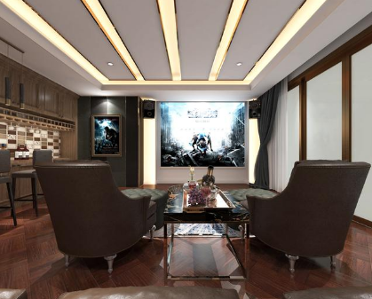 影音室相比明快的其他空間要略顯莊重,重色的運(yùn)用是為了更加凸顯投影的方向的視覺集中性,旁邊的水吧區(qū)在功能上做到了互補(bǔ),是這個空間的功能完美的形成了閉環(huán),主人在這個空間中可以做到極致的放松和享受。