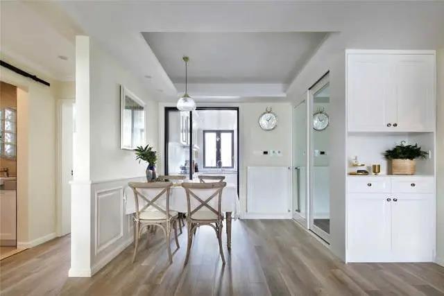 餐廳空間通透,淡淡的鵝黃色墻漆,搭配白色護(hù)墻板,空間更加明亮。餐廳與廚房采用三折疊門設(shè)計(jì),讓光線更好的進(jìn)入室內(nèi),提高整體采光與通透感。