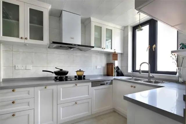 廚房使用淺色的瓷磚、白色的櫥柜門,搭配金屬色的圓形門把手,平添了幾分精致時(shí)尚。u型廚房設(shè)計(jì),不僅拓寬了臺(tái)面空間,還提高了廚房整體收納。原來1㎡的北陽臺(tái)被改造成了廚房電器區(qū),冰箱,烤箱,蒸箱,熱水器全布置在里面,空間整潔又實(shí)用。