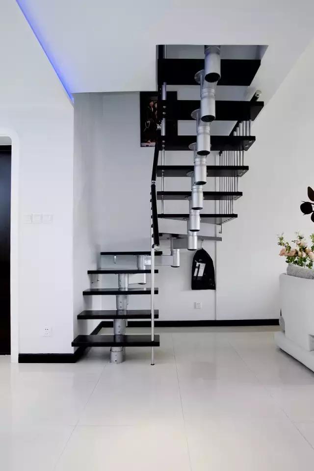 兩段式的鋼結構樓梯,好看又簡單。同時樓梯底下也是收納和裝飾的空間,空間利用率大大增加。