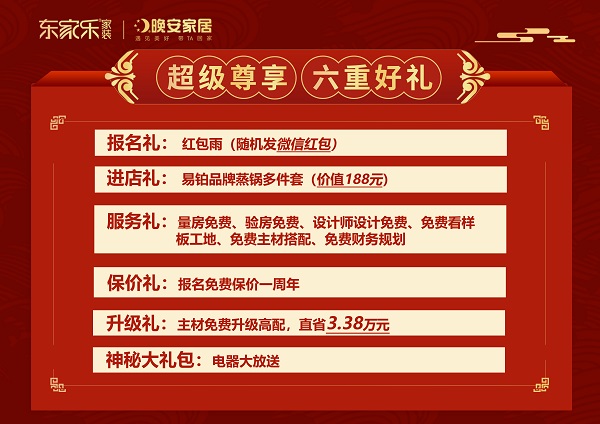 東家樂家裝新春開門紅·新品上市,為搶定的VIP業(yè)主送上鉅惠大禮包——“百萬紅包·千萬補貼”裝修鉅惠,晚安品牌家具10大件鉅惠加增禮,品牌家電大禮包限時送,還有一線品牌新品材料免費升級禮,精工工藝免費升級禮,以及開門紅大吉大利鉅惠紅包上門抽。東家樂家裝讓新春第一批樣板房搶定業(yè)主奉上前所未有的VIP特權(quán)專享福利。