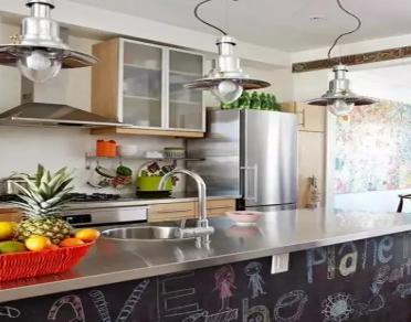 能夠自然隨意彎曲的別致吊燈已經(jīng)足夠成為這間廚房的亮點,而在下方櫥柜背后還有大塊面的黑板設(shè)計也足夠讓人過目不忘。這樣的廚房一定是為了家中有調(diào)皮寶貝的家庭所設(shè)計,忙于烹飪的主婦們在烹飪的同時,也許會無暇顧及到一旁好動的寶貝,那么就可以讓小朋友在這面黑板前用心作畫吧。