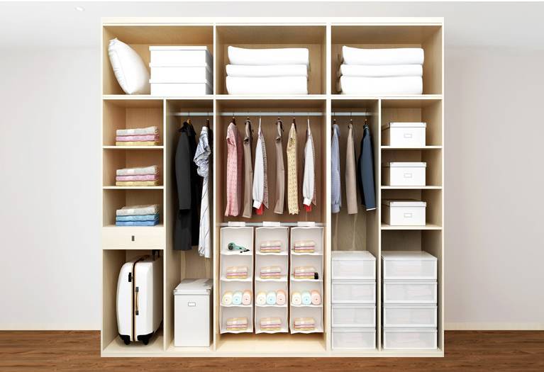 一般衣柜都會(huì)分為被褥區(qū)、疊放區(qū)、長(zhǎng)衣區(qū)等,可以根據(jù)各個(gè)區(qū)域的常規(guī)尺寸進(jìn)行劃分,不同的區(qū)域盛放不同類(lèi)型的衣物,這樣不僅方便整理,也方便收拾和使用。