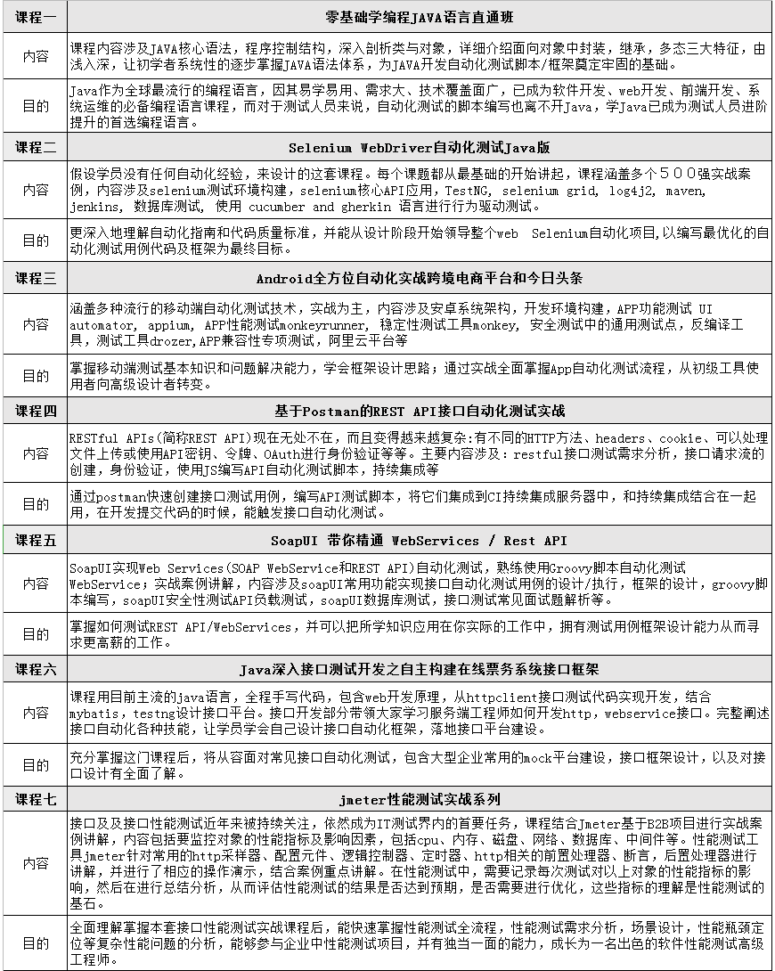 本課程以Java全棧測(cè)試開(kāi)發(fā)為目標(biāo),從Java核心語(yǔ)法入手,養(yǎng)成面向?qū)ο蟪绦蛟O(shè)計(jì)思維,為后續(xù)自動(dòng)化測(cè)試腳本研發(fā)和框架構(gòu)建奠定基礎(chǔ),課程以多個(gè)知名實(shí)戰(zhàn)案例為主,涵蓋企業(yè)項(xiàng)目中主流自動(dòng)化測(cè)試類(lèi)別:web自動(dòng)化,移動(dòng)端自動(dòng)化,接口自動(dòng)化,以及性能測(cè)試;課程注重測(cè)試需求分析能力,編碼能力,自動(dòng)化腳本的研發(fā)及框架設(shè)計(jì)構(gòu)建能力,為進(jìn)階測(cè)試開(kāi)發(fā)打下扎實(shí)基礎(chǔ),從而更好地確保進(jìn)入企業(yè)后能快速上手,輕松融入自動(dòng)化測(cè)試團(tuán)隊(duì),并能獨(dú)立承擔(dān)企業(yè)核心自動(dòng)化框架/平臺(tái)研發(fā)等高級(jí)任務(wù)。